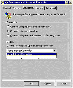 5. Now click on the 'Connection' tab at the top. Select 'Connect using my phone line', then select your connection from the menu underneath. This will ensure that Outlook Express will automatically dialup the correct connection. This must be set as your ISP, in some cases you may have connect using my Local Area Connection, this will be used in some broadband configurations.