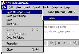 When you're ready to send your message, click on the "File" menu and select "Send Message Using". A further menu will appear allowing you to select which address to send the message from. The message will now bear the correct identification and reply-to address.
